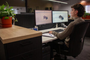 Dennis: ‘’In mijn rol ga ik middels methodisch ontwerpen aan de slag. Je doorloopt verschillende fases, te beginnen met oriënteren. Welke programma’s heb je nodig? Wat houdt het allemaal in. Daarna ga je analyseren. In mijn geval heb ik dus verstelmechanismen van andere machines geanalyseerd. Wat zijn de mogelijkheden? Vervolgens ga ik voor processen en problemen deeloplossingen verzinnen. Op basis van weegfactoren werk ik dat uit. Dat zijn de beste concepten, waar Tummers vervolgens mee aan de slag kan gaan’’.
